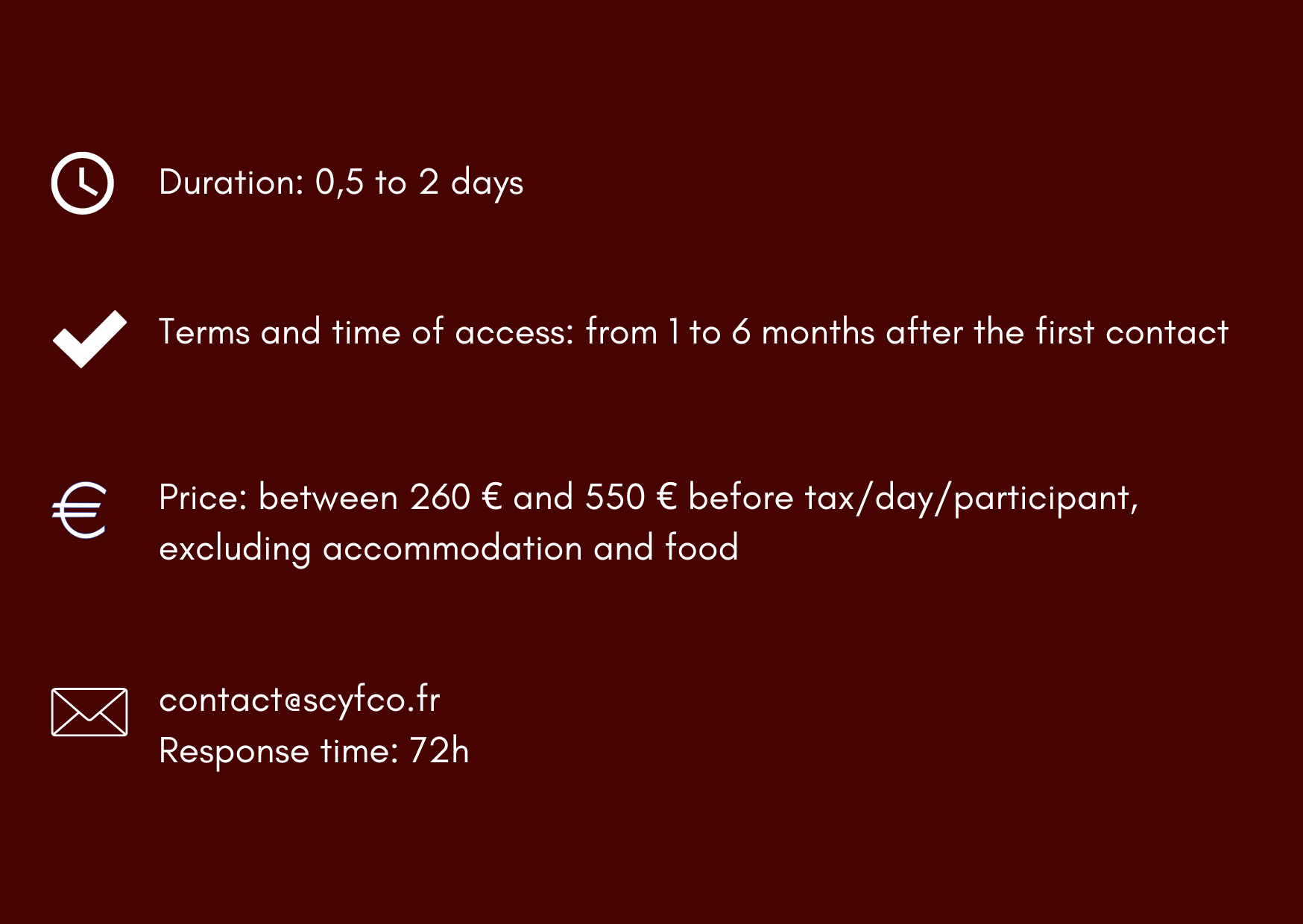 Accessibility for people with disabilities ♿ All our services are accessible to people with disabilities. For further information, and in particular for compensation needs, please contact the training organization at the following address : handicap@scyfco.fr.